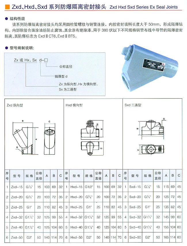 Zxd系列縱(zòng)向防爆隔離密(mì)封接頭 Hxd系列橫(héng)向防爆隔離密(mi)封接頭 Sxd系列三(sān)通防爆隔離密(mì)封接頭 HJD系列防(fang)爆活接頭 BJT系列(liè)防爆管接頭配(pèi)件